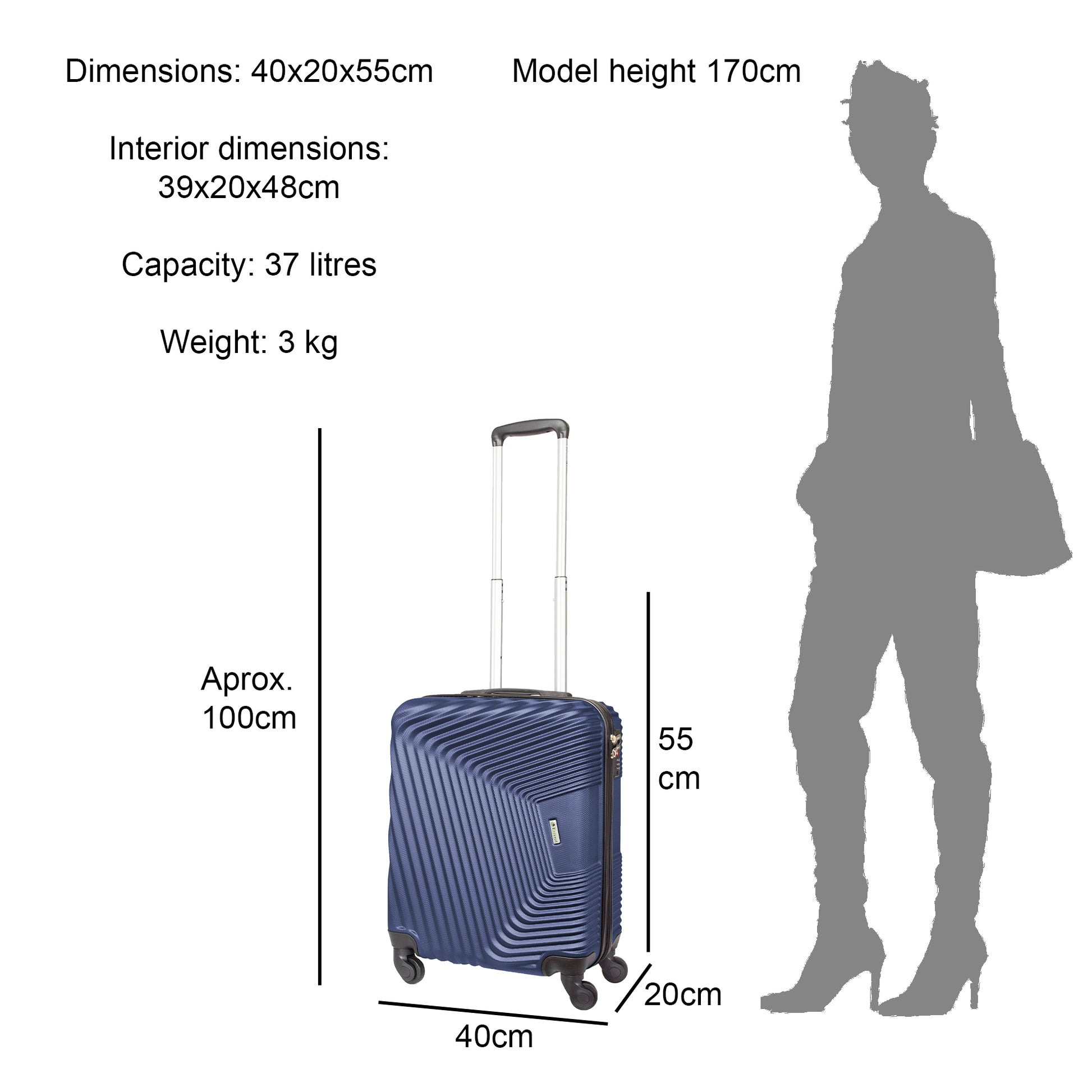 SIZE: This hard case luggage is compatible with many airlines operating in the UK and around the globe. So, whether you're flying for business or weekend short stays, this stylish suitcase will be your best choice for your every trip. (Please check with your airline before purchasing).