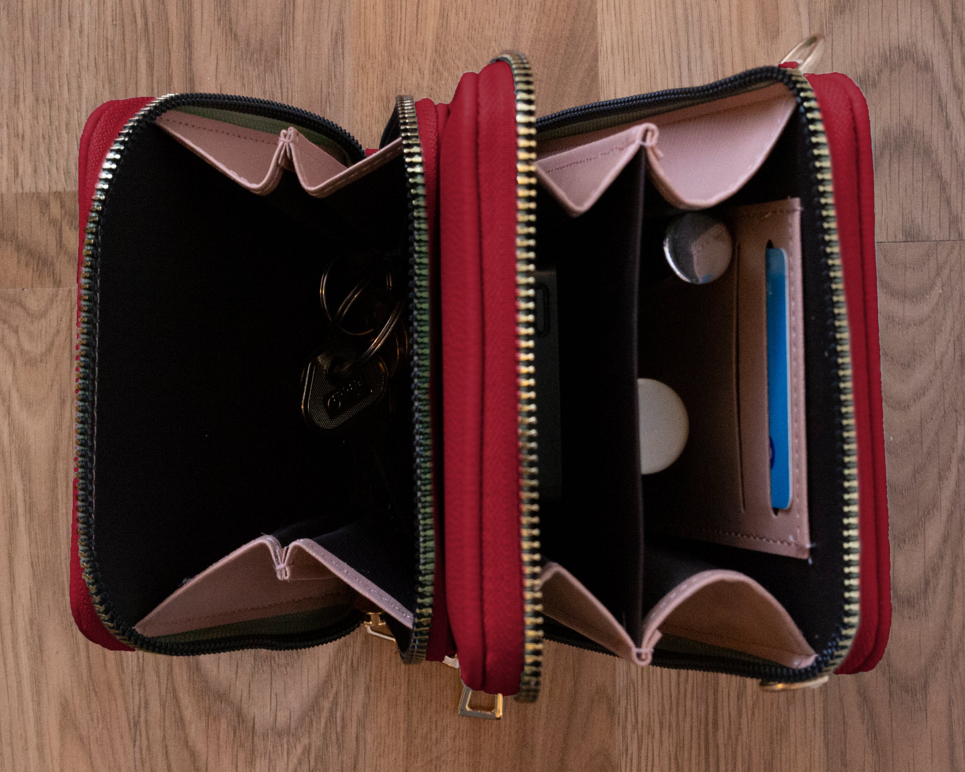 Small crossbody/shoulder bag that can be used as a purse by removing the strap. Comprises of 2 compartments with multiple card slots. Can be used as a shoulder bag, crossbody bag or remove the strap and use it as a money purse or phone purse. Easy to carry, great for shopping, traveling, holidays, trips, evenings, dog walking.