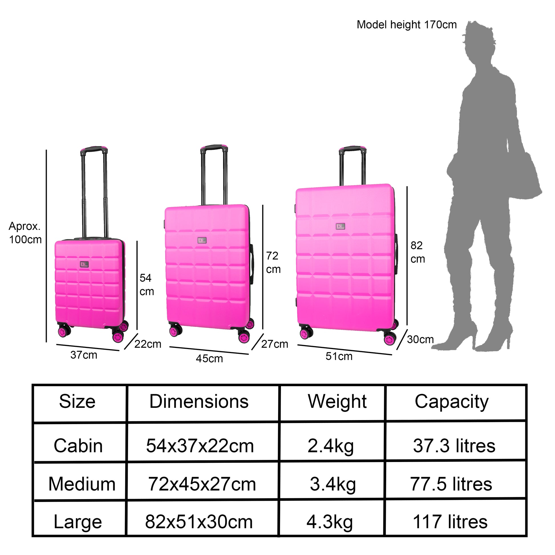 SIZE: This hard case luggage is compatible with over 100 airlines operating in the UK and around the globe. Including Ryanair, British Airways, KLM, Virgin Atlantic, Emirates, Delta, Jet2 and so on. So, whether you're flying for business or weekend short stays, this stylish suitcase will be your best choice for your every trip.