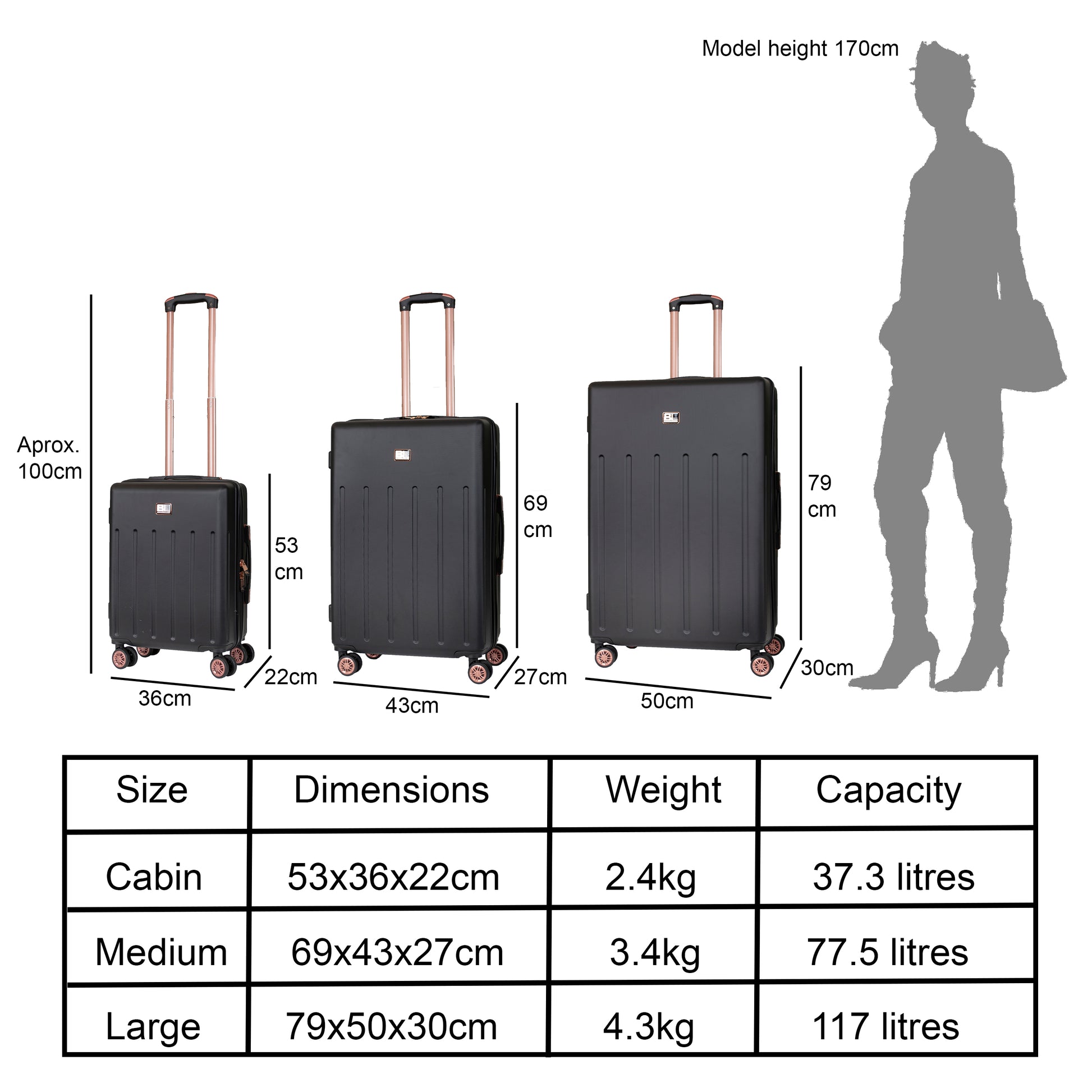 SIZE: This hard case luggage is compatible with over 100 airlines operating in the UK and around the globe. Including Ryanair, British Airways, KLM, Virgin Atlantic, Emirates, Delta, Jet2 and so on. So, whether you're flying for business or weekend short stays, this stylish suitcase will be your best choice for your every trip.